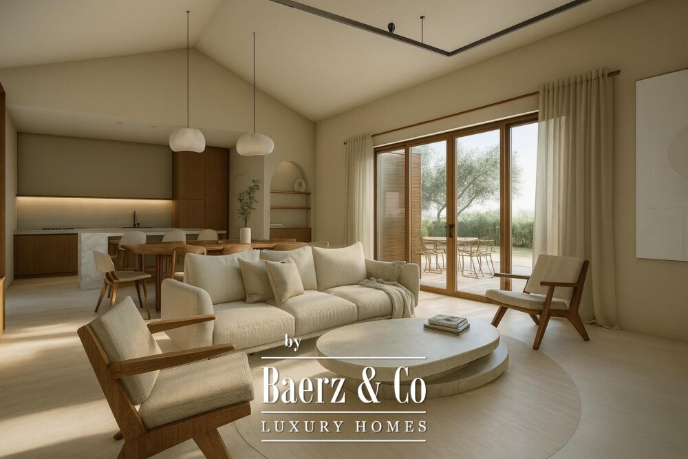 Binnen beschikt de villa over drie slaapkamers en drie ingetogen badkamers. De moderne keuken loopt naadloos over in de open eet- en leefruimte, waardoor een sfeer ontstaat die wordt gekenmerkt door strakke lijnen, veel daglicht en ruimtelijke helderheid. Daarnaast voorzien een privéfitness en gastfaciliteiten in verfijnd dagelijks comfort. Nauwkeurig geselecteerde materialen benadrukken de kwaliteit en ingetogen elegantie in het hele huis.