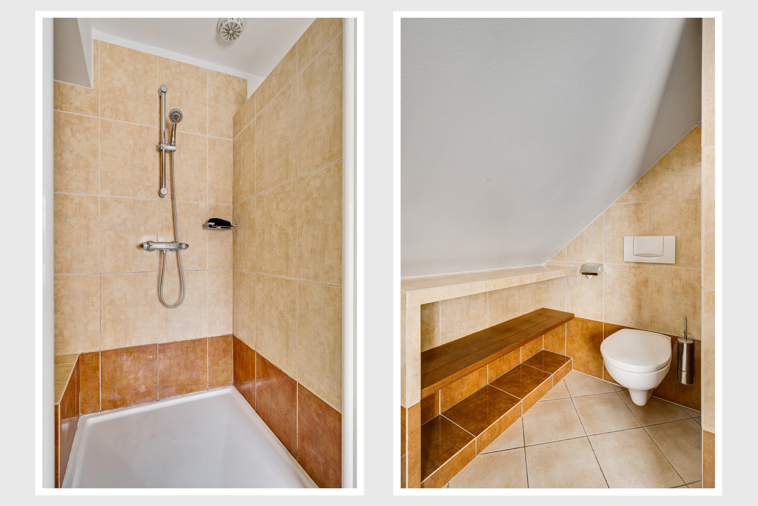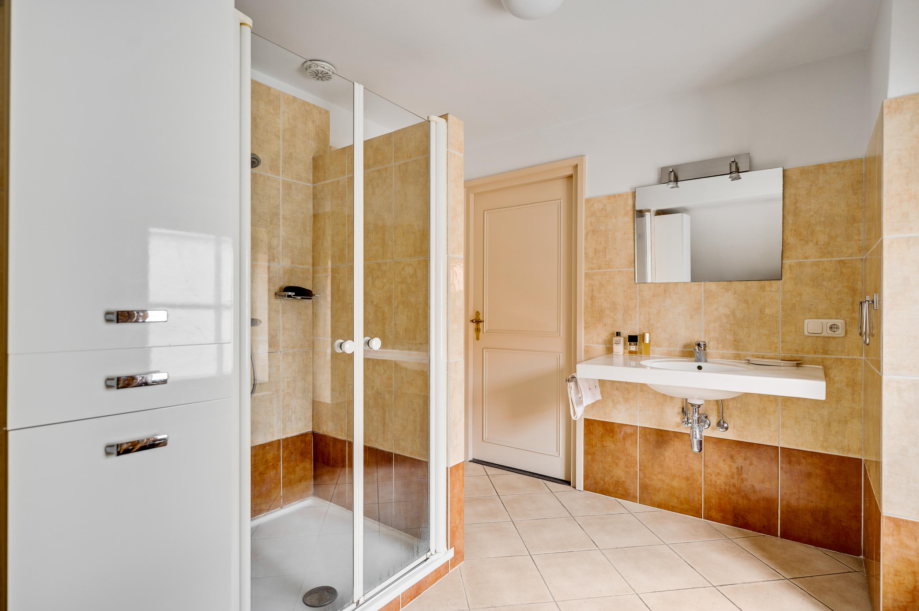 Luxe, vrijwel geheel betegelde badkamer met wastafel, toilet en douchecabine, inclusief wasmachine-aansluiting.