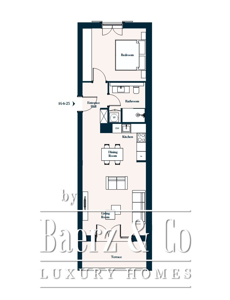 Het appartement omvat een woonruimte met keuken en eethoek, één slaapkamer, een badkamer en een terras met gedeeltelijk uitzicht op zee. De oplevering staat gepland voor december 2027, waarbij hedendaags ontwerp wordt gecombineerd met een doordachte indeling die zowel ontspanning als dagelijks comfort waarborgt.