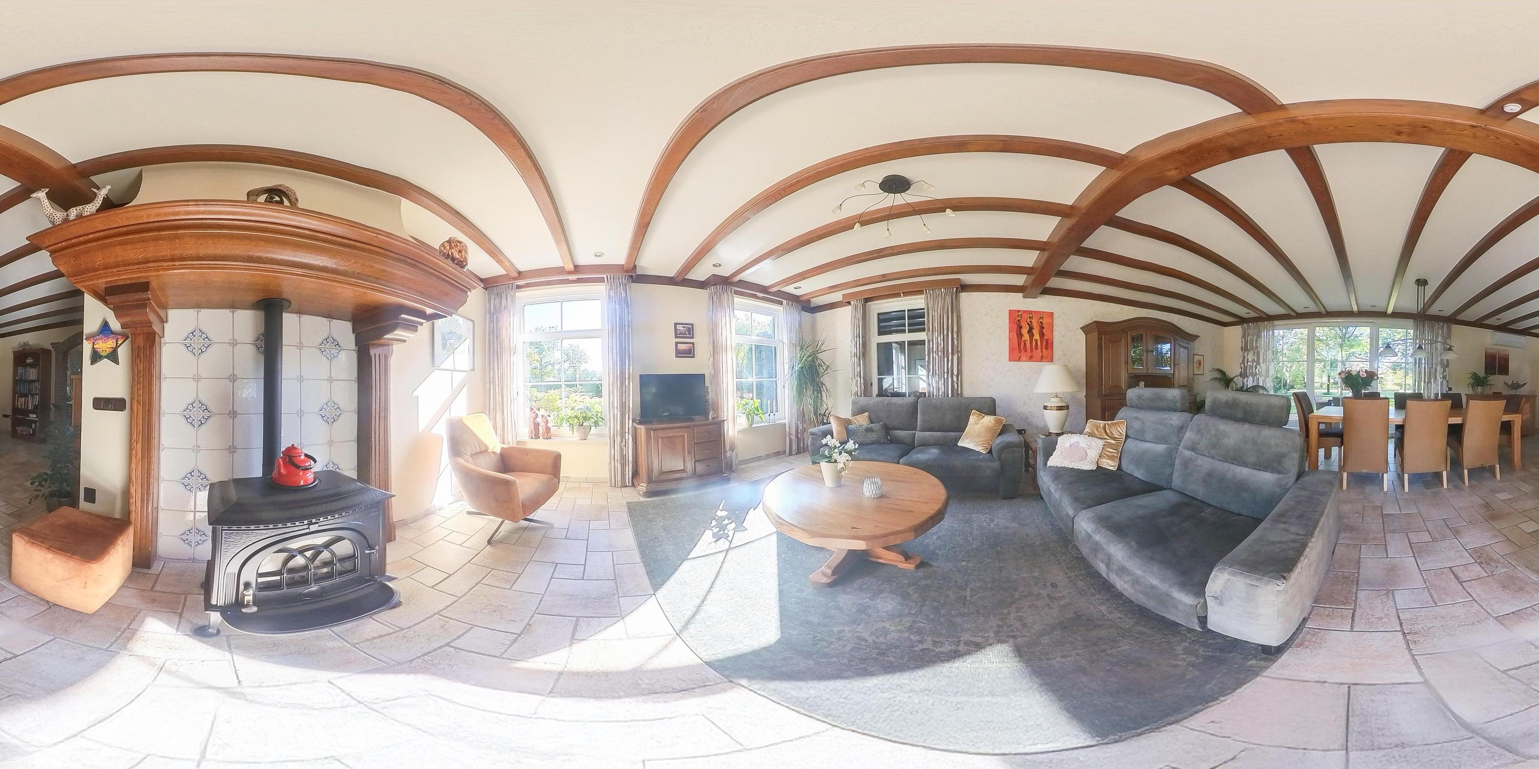 trap biedt toegang tot de 1e verdieping. De royale woonkamer is een heerlijke ruimte. De grote raampartijen en een schuifpui bieden een prachtig vrij uitzicht op de tuin. Het houten balken plafond en de schouw met gaskachel zorgen voor extra sfeer in de ruimte. Ook is er airconditioning aanwezig. De keukeninrichting in de leefkeuken is in een hoekopstelling geplaatst en uitgerust met een vaatwasser, spoelbak, keramische kookplaat, oven, magnetron en een koelkast. Vanuit de keuken bieden raampartijen ook zicht op de tuin. De bijkeuken is deels betegeld en uitgerust met de aansluitingen voor de wasapparatuur. Een loopdeur zorgt voor toegang tot de achtertuin. De badkamer is geheel betegeld en ingericht met een ligbad, een dubbele wastafel met meubel en een designradiator. Aangrenzend aan de badkamer is de slaapkamer gelegen.