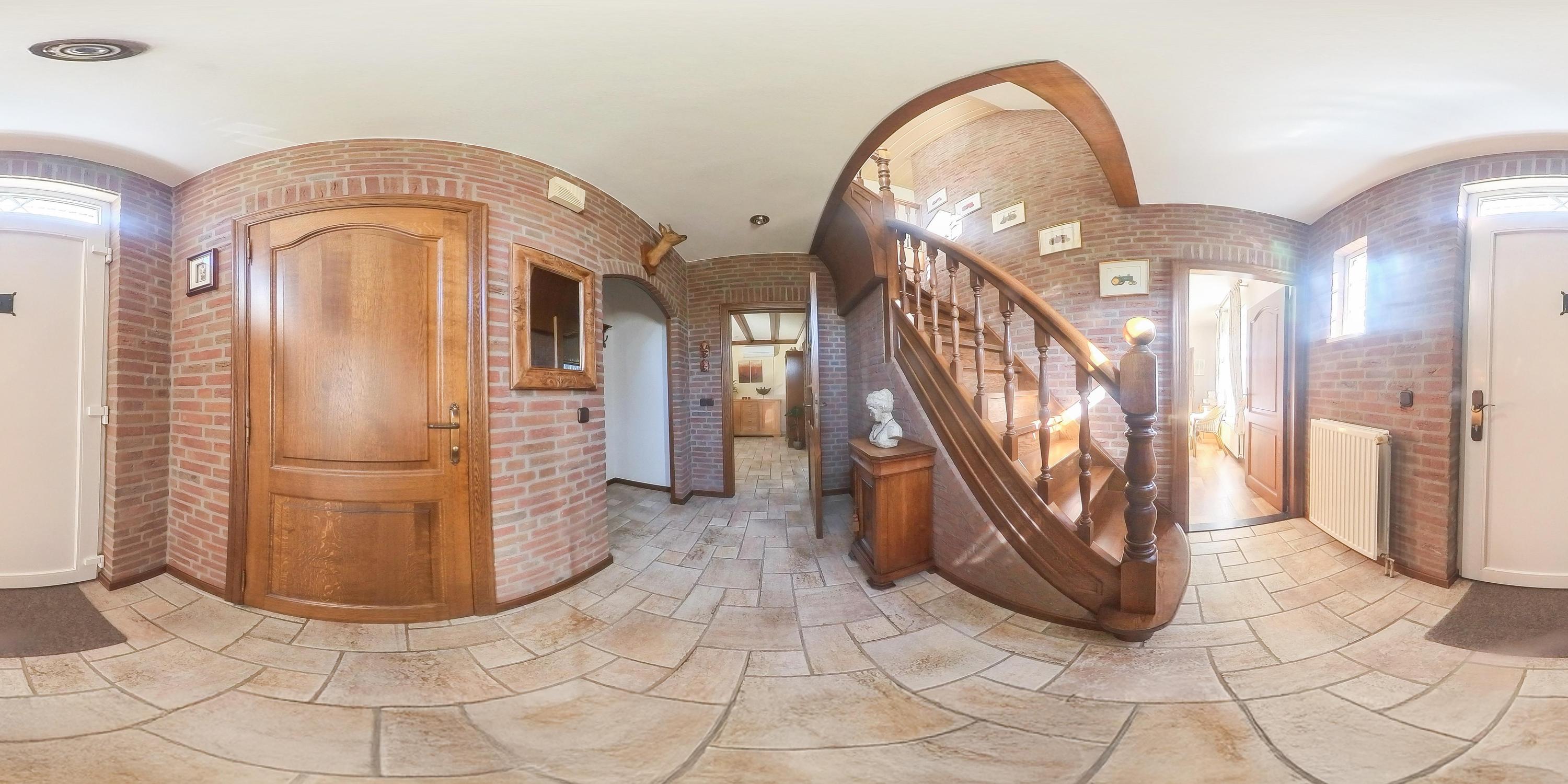 De ruime entreehal biedt toegang tot de woonkamer, toiletruimte, garderobe en de meterkast. Een fraaie houten