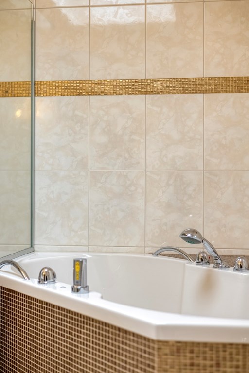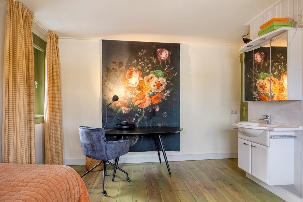 De woonkeuken is modern uitgevoerd met luxe apparatuur zoals een groot gasfornuis, een schouwafzuigkap, vaatwasser, koel- en vrieskast, airconditioning en een Quookerkraan. Hier kookt u met zicht op de tuin, terwijl het natuurlijke licht mooi over de gouden fronten van de keuken strijkt. Ook via de keuken zijn de serre en achtertuin toegankelijk gemaakt. Aangrenzend bereikt u enerzijds de praktische bijkeuken met witgoedaansluitingen en anderzijds een riante slaapkamer, met een evenzo riante walk-in closet en een badkamer en suite. Een schuifpui verbindt de slaapkamer met de tuin, en ook via de walk-in closet kunt u de tuin eenvoudig bereiken. De ruime badkamer is voorzien van licht tegelwerk en een lichtkoepel, een whirlpool, dubbele wastafel, een inloopdouche, wandcloset en volop opbergruimte.