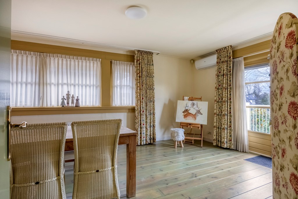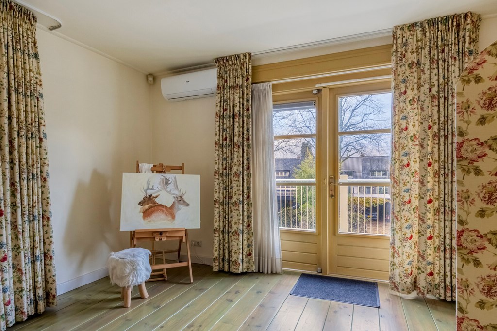 De eerste verdieping brengt u op de lichte overloop met airconditioning, en grenst aan drie ruime slaapkamers en een tweede badkamer. Elke kamer heeft zijn eigen charme en een handig wastafelmeubel. De grootste kamer is eveneens voorzien van airconditioning en biedt toegang tot het royale balkon middels openslaande deuren, vanwaar u uitkijkt over de diepe tuin. De badkamer op deze verdieping is functioneel ingedeeld met een wastafel, douche en toilet. De verdieping voelt luchtig door de ruimte en de hoeveelheid daglicht die overal naar binnen valt.