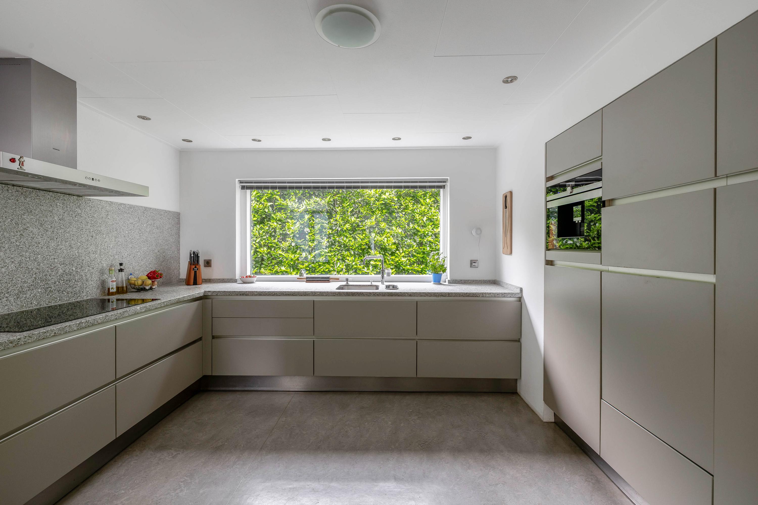De half open greeploze Siematic keuken is een droom voor elke thuiskok. De keuken is voorzien van een gebrand granieten blad, spoelbak met een Fusion Quookerkraan ,afzuigkap, een 5-pits inductie kookplaat (11kW) en een wandopstelling met Home Connect combi-oven, twee koelkasten, een volautomatische koffiemachine met vele