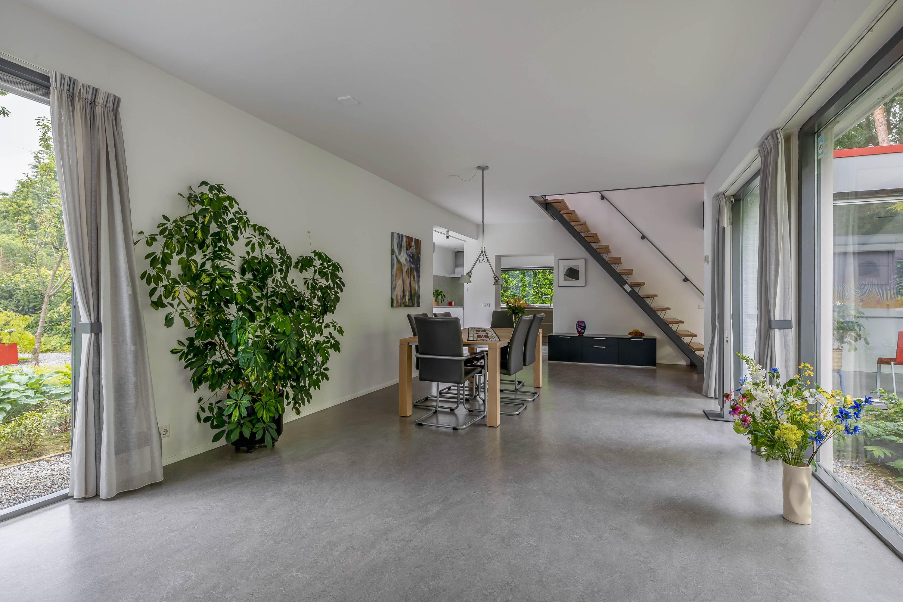 Verkopers over hun bosvilla in Vessem: ‘Vielen voor architectuur’. Na twintig jaar nemen verkopers afscheid van hun bijzondere plek aan de rand van Vessem. “We vielen destijds onder meer voor de vorm en de lichtinval”. Toen verkoper het huis begin jaren 2000 samen met zijn toenmalige vrouw bezocht, was het direct raak. “De bijzondere architectuur sprak ons meteen aan”, vertelt hij. “Door het vele licht en de zichtlijnen voelde het meteen heel eigen. Later ontdekte verkoper dat de villa is ontworpen volgens het zogeheten plastisch getal. Dit is een verhoudingenleer waarin ruimtes en lijnen elkaar volgens vaste maatverhoudingen versterken. Die principes worden ook toegepast binnen de Bossche School, een naoorlogse architectuurstroming. “Iemand kwam op bezoek en zei meteen: dit is zo’n huis. Ik had er nog nooit van gehoord. Maar toen ik me erin verdiepte, klopte het precies.” Ook vindt hij de vijftien glas-in-loodramen in de stijl van de bekende Nederlandse kunstenaar Piet Mondriaan bijzonder. “Die heb ik laten ontwerpen. Ze passen prachtig bij de architectuur.”