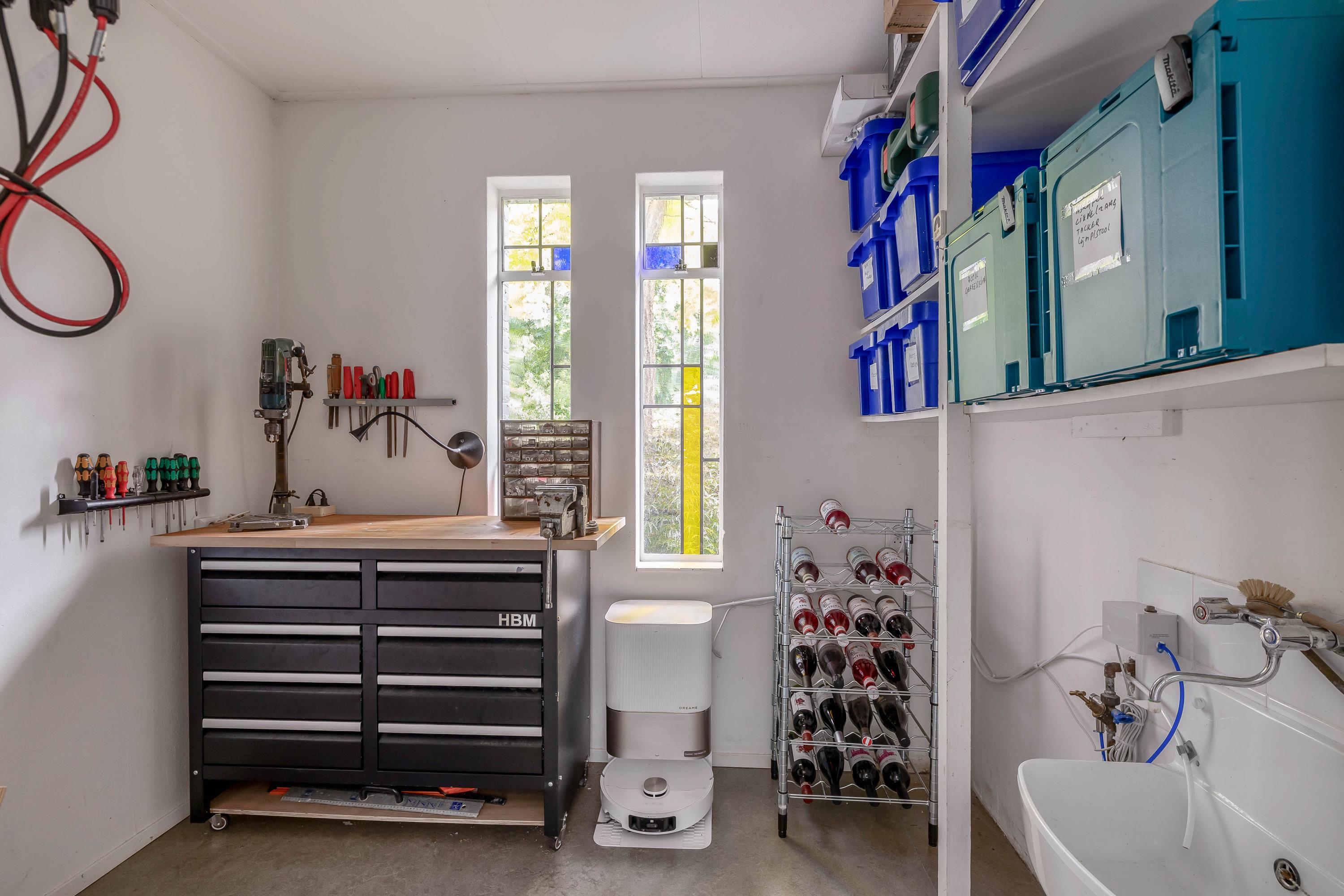 Hier vind je niet alleen een handige berging met vernieuwde meterkast 3x25A en 12 groepen, uitstortgootsteen, plus de omvormer voor de zonnepanelen, maar ook een washok met aanrecht/spoelbak, plek voor wasmachine en -droger, opbergkasten en een geheel betegeld toilet met fonteintje en mechanische afzuiging.