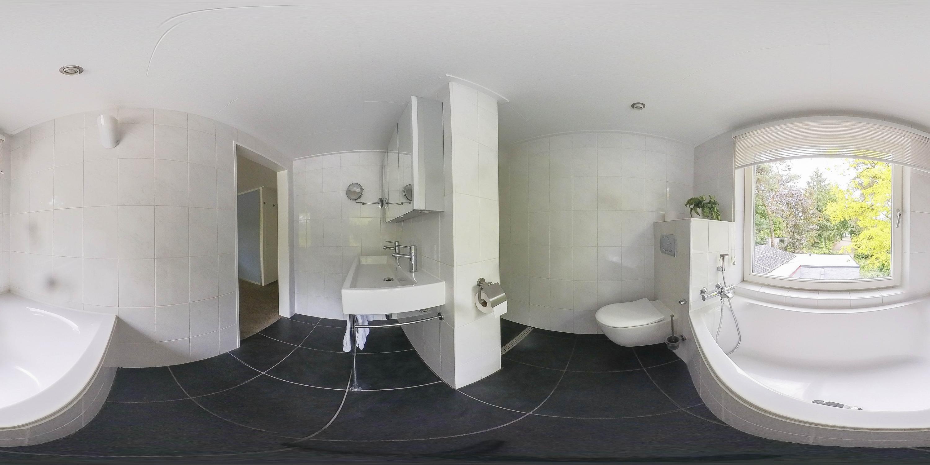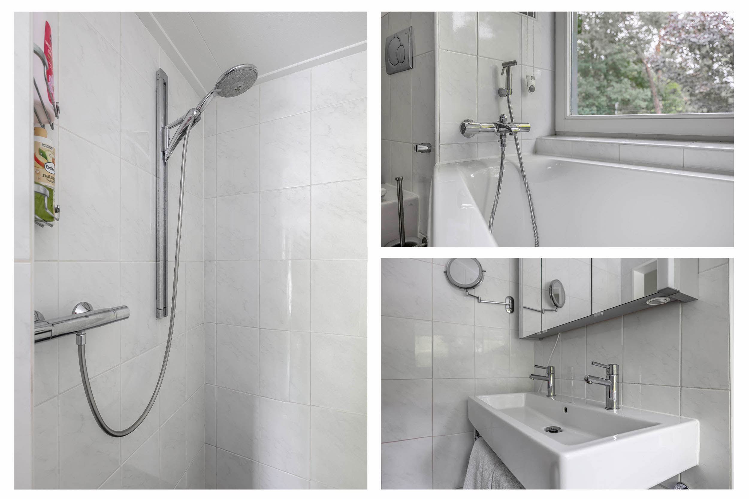 De tweede geheel betegelde badkamer, aansluitend gelegen aan slaapkamer 2, is compleet uitgerust met een inloopdouche, een heerlijk ligbad, een thermostaatkraan, een dubbele vaste wastafel met mengkraan en een doorstroomboiler.