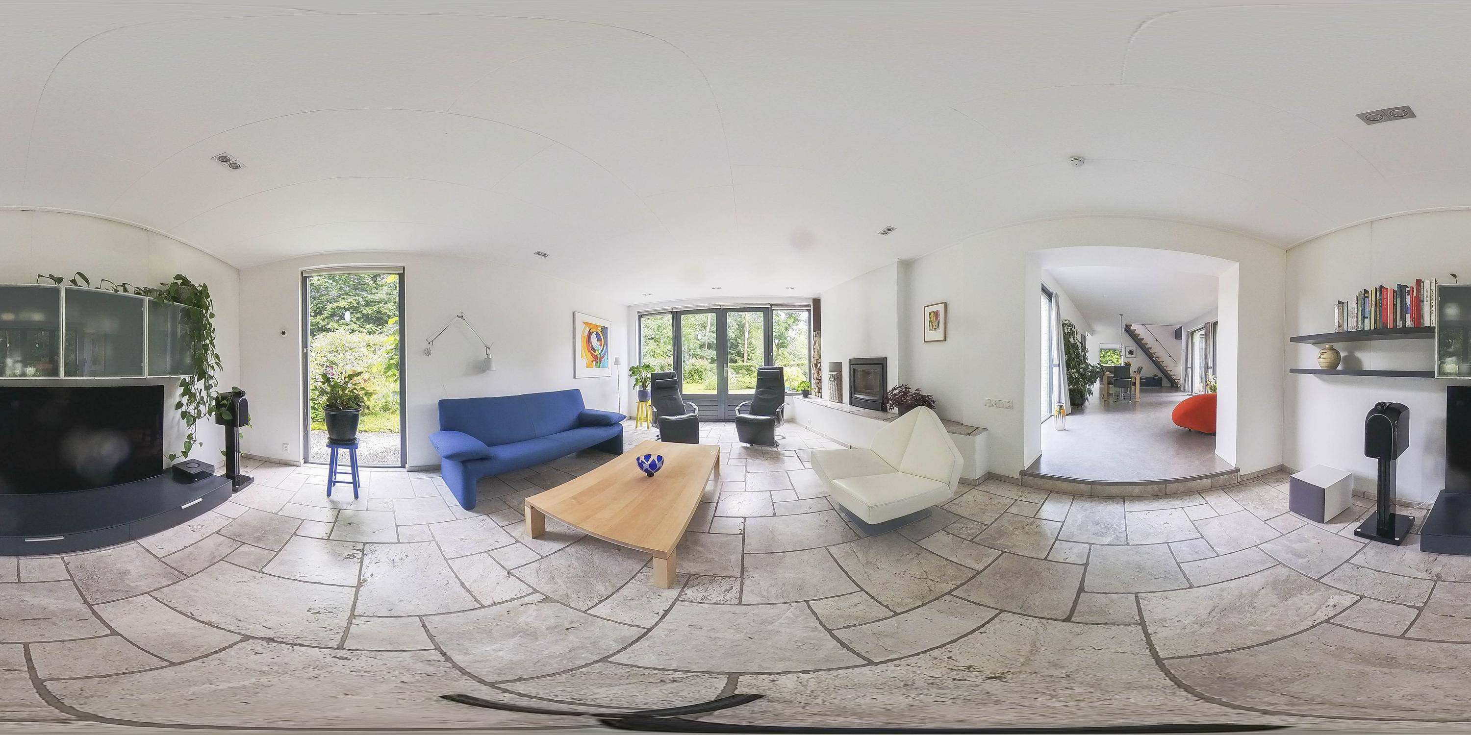 De open doorloop vanuit de entreehal leidt je naar de lichte en ruime woonkamer. Deze is afgewerkt met strak stucwerk op de wanden en de grote raampartijen tot vloerniveau bieden zicht op de patiotuin . Vloeren zijn uitgevoerd met vloerverwarming alsmede de mogelijkheid tot verkoeling, wat zorgt voor een aangenaam klimaat in elk seizoen. Een blikvanger in de woonkamer is de open trapopgang van esdoornhout en staal naar de verdieping.