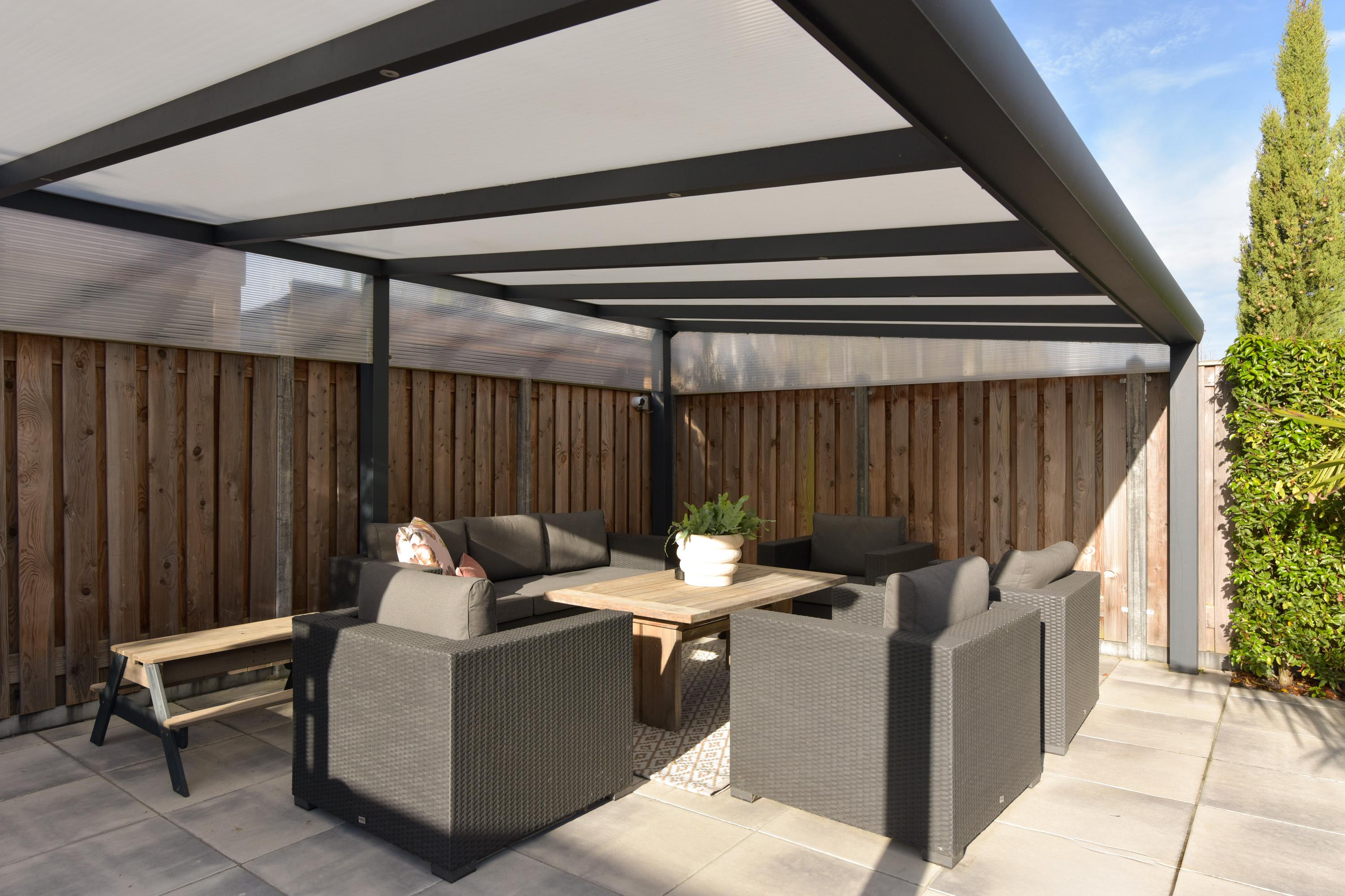 De achtertuin op het westen is een heerlijk verlengstuk van de woonkamer en ademt dezefde verfijning als het interieur. Door de ligging geniet u hier vanaf de middag tot laat in de avond van de zon. De tuin is speels en praktisch ingedeeld met meerdere terrassen, een gazon met ingebouwde trampoline en achterin een sfeervolle veranda met verlichting – een perfecte plek voor lange zomeravonden. Alle voorzieningen zijn tot in detail doordacht: de containers zijn netjes uit het zicht geplaatst, er is een poort aan de zijkant voor de achterom en zowel de voor- als achtertuin is uitgerust met een automatische beregeningsinstallatie. Aan de voorzijde van de woning bevindt zich bovendien een extra berging, ideaal voor fietsen, tuinspullen of gereedschap.