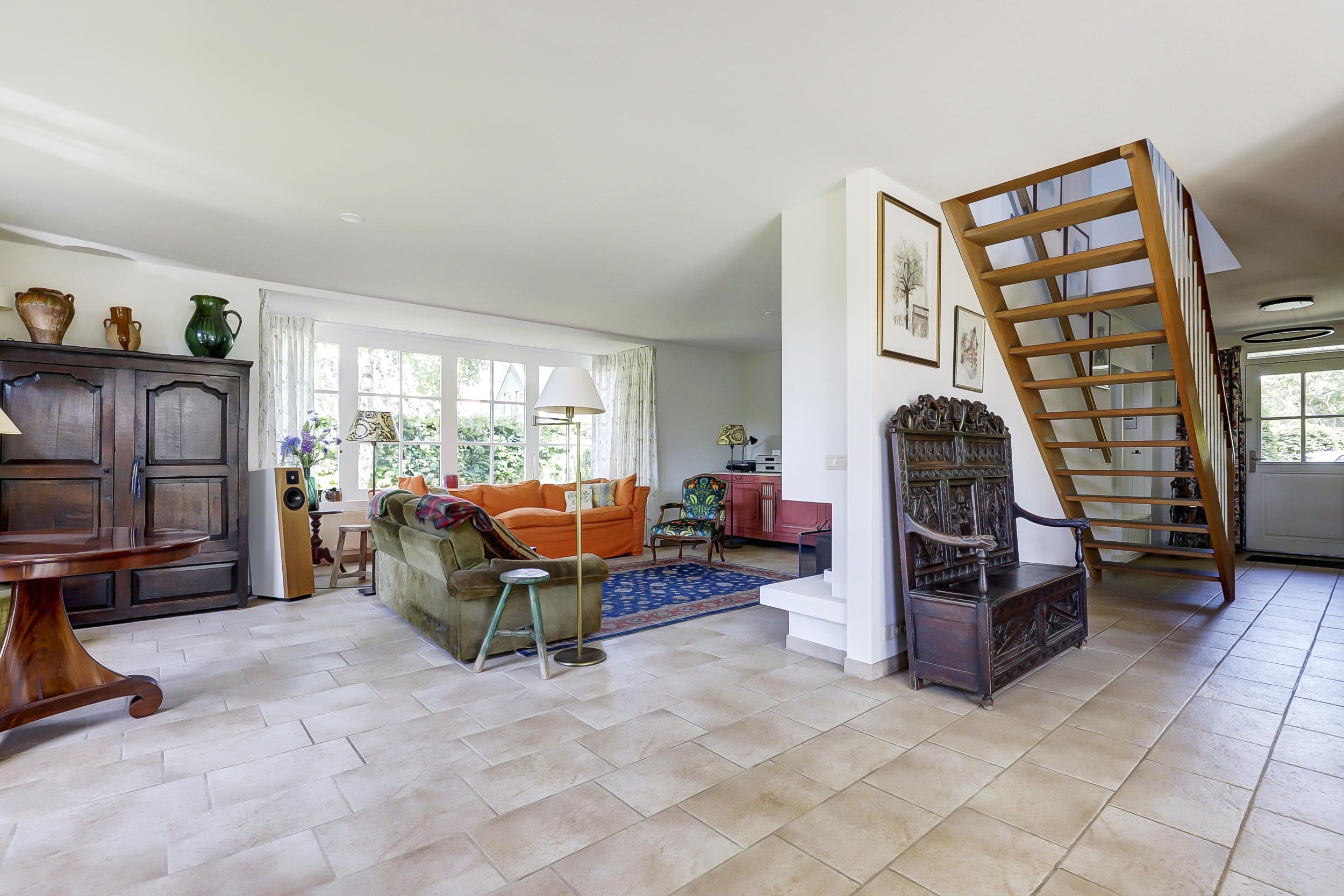 Het huis beschikt over een royale, lichte living met een erker en een sfeervolle open haard. De woonkamer is lekker licht door de grote raampartijen en de openslaande tuindeuren. De living staat in een open verbinding met de ruime eetkeuken, die plaats genoeg heeft voor een grote eettafel. Ook hier zijn openslaande tuindeuren die openen naar het zonnige terras met veranda.