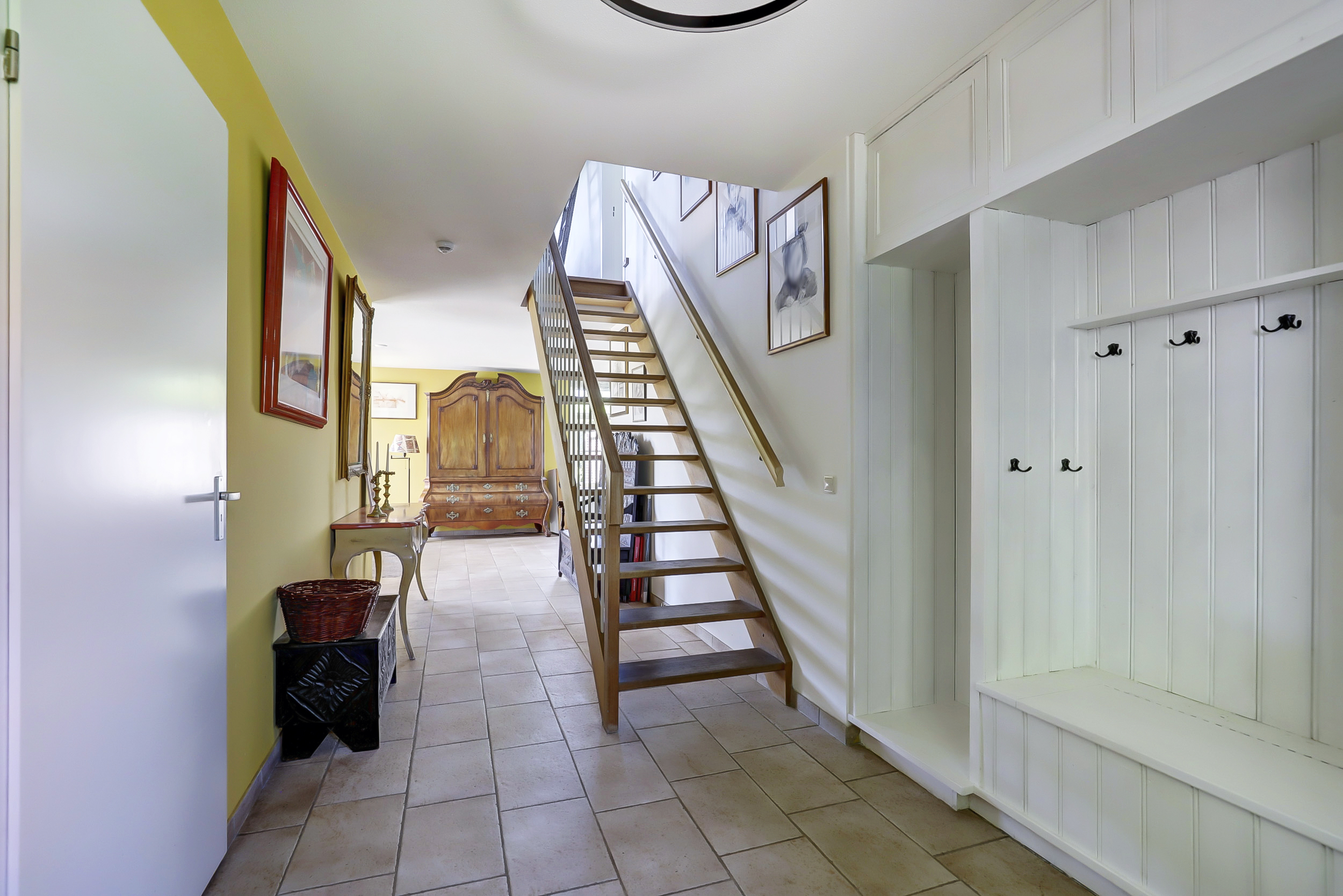 De entree van het huis bevindt zich aan de linkerzijde. Meteen links een kleine badkamer met WC, bidet-handdouche, inloopdouche en wastafel, kastruimte en rechts de meterkast, garderobe en trapopgang.