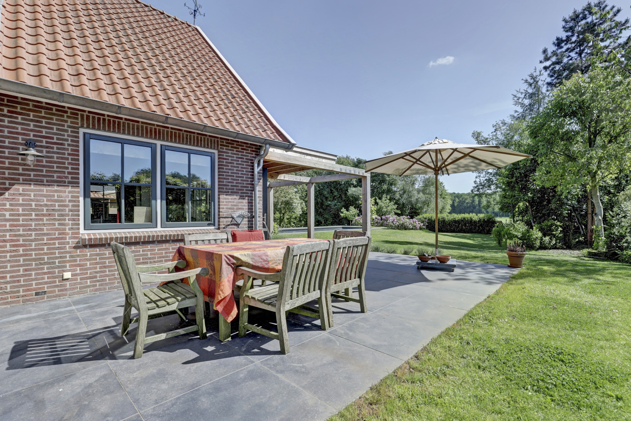 Achter de keuken het heerlijke zonneterras met veranda. De siertuin is prachtig, met een groot gazon, een vruchtenboomgaard en fraai ingerichte borders en bloemperken. De tuin is voorzien van een beregeningsinstallatie op grondwater en de automatische grasmaaier zorgt ervoor dat het gazon er als een biljartlaken bij ligt.