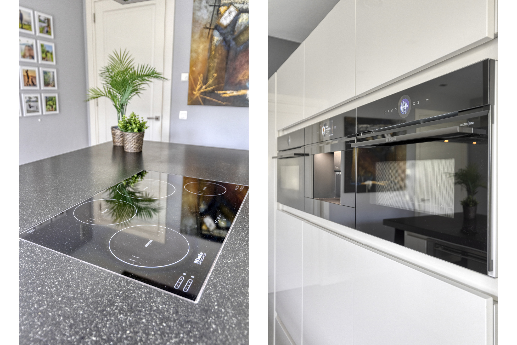 Woonkeuken: moderne Bosch/Miele?inbouwapparatuur met kook-/spoel-eiland en geïntegreerde eettafel; composiet werkblad met dubbele spoelbak en Quooker; Miele inductiekookplaat met Miele afzuigschouw; kastenwand met Bosch inbouw koffiemachine, Bosch koelkast (met freshzone), Bosch vriezer, 2x Bosch combi?oven/magnetron, ATAG elektrische oven (90 cm), Miele vaatwasser op ergonomische hoogte.