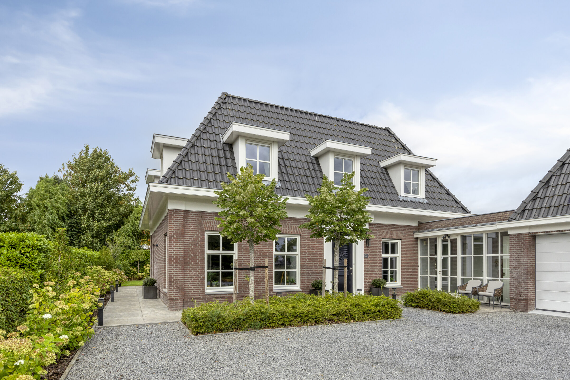 Het buitenleven is goed verzorgd. De tuin is fraai aangelegd en uitstekend onderhouden, met natuurstenen terrassen, veel groen en een automatische beregeningsinstallatie. De zonnige ligging, de dubbele garage met gepolijste en gecoate betonvloer en de royale oprit – bereikbaar via een tweedelige elektrische toegangspoort die klasse en kwaliteit uitstraalt. Prachtig uitzicht op landerijen en de molen van Wouw.