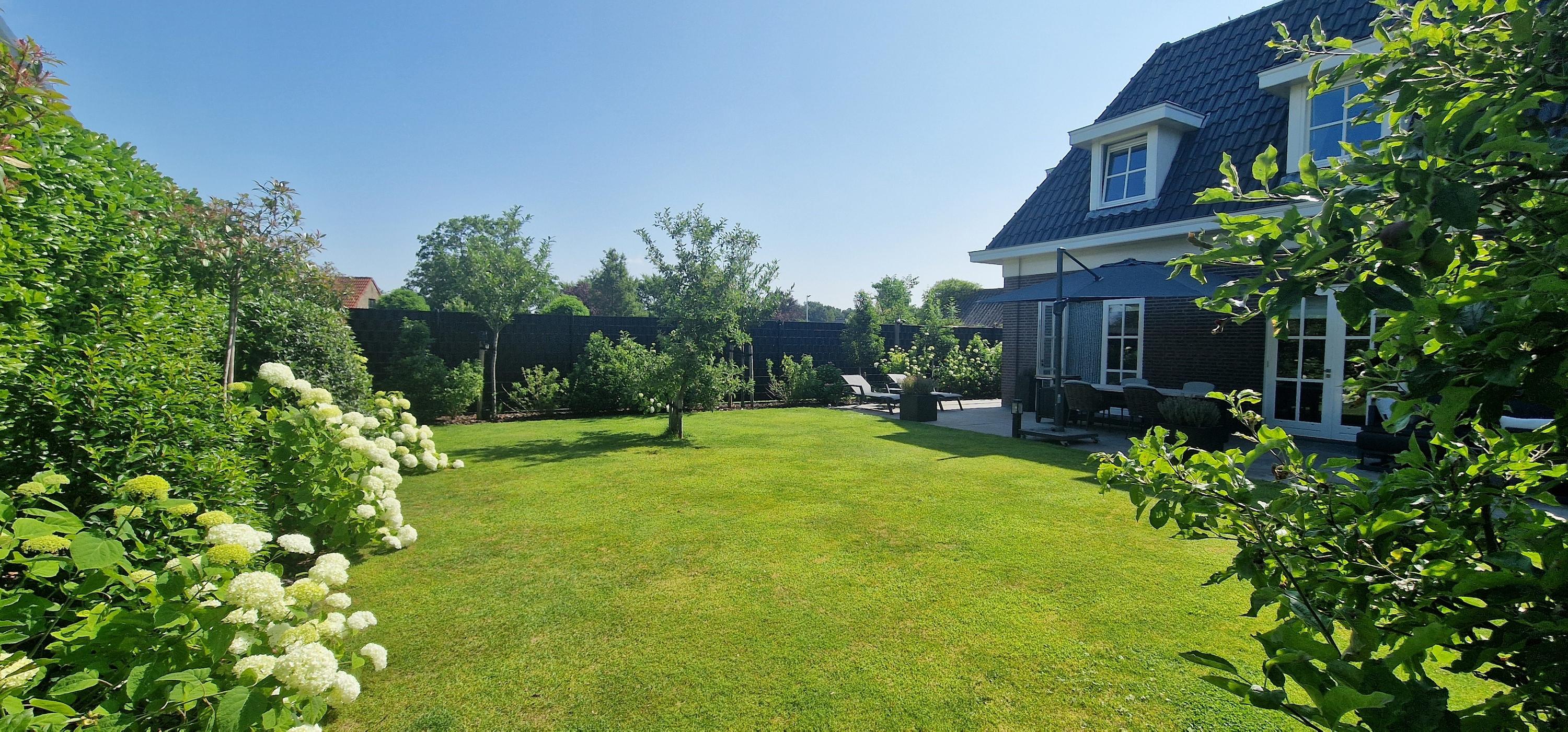 Fraai aangelegde tuin, volledig rondom omheind; met borders, gazon, buitenkraan, beregeningsinstallatie, tuinverlichting en natuurstenen terrassen.