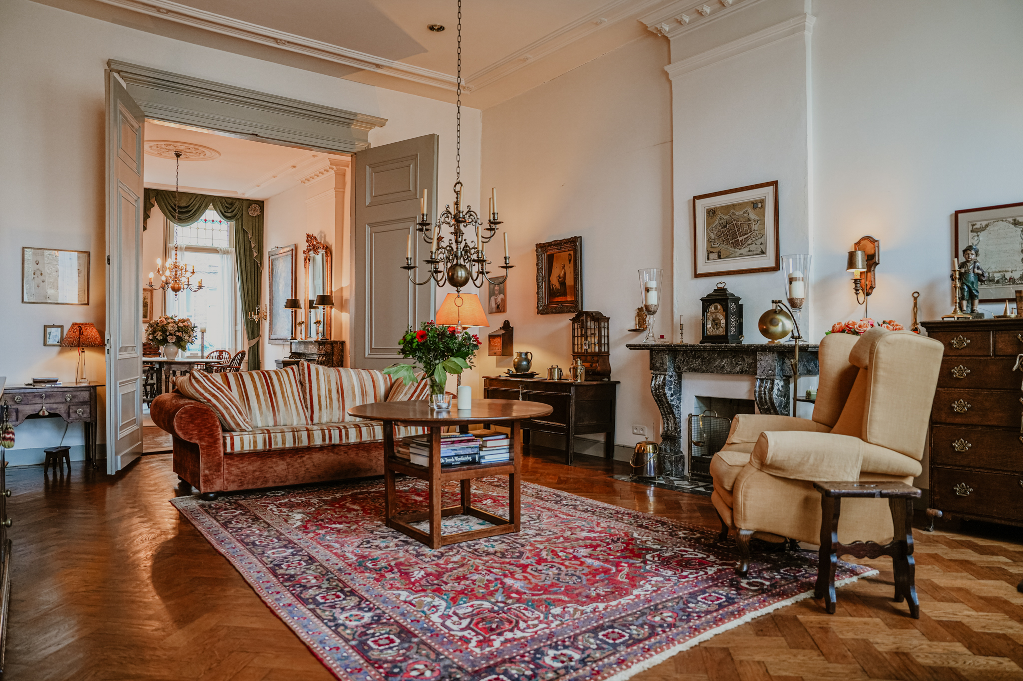 De woonkamer heeft hoge stucplafonds, hoge vensters met glas-in-lood bovenlichten, twee natuurstenen schouwen, zitvensterbanken, binnenluiken, vaste kasten en visgraatparket. Aan de achterzijde geven twee paar dubbele deuren toegang tot de tuin. Aan de eerdergenoemde gang grenzen een kelder, de bijkeuken en de eetkeuken. In de vloer van de kelder biedt een glasplaat zicht op de historische waterput. De bijkeuken bevindt zich op de plaats waar vroeger de buitenruimte van de westelijke woning was in de tijd dat het nog twee panden waren. In de gang zijn de 18e-eeuwse pomp met hardstenen spoelbak en koperen kranen nog aanwezig. De eetkeuken is ingericht met een klassiek keukenmeubel voorzien van enige inbouwapparatuur en een terrazzo-werkblad. Vanuit de keuken is zicht op de tuin.
